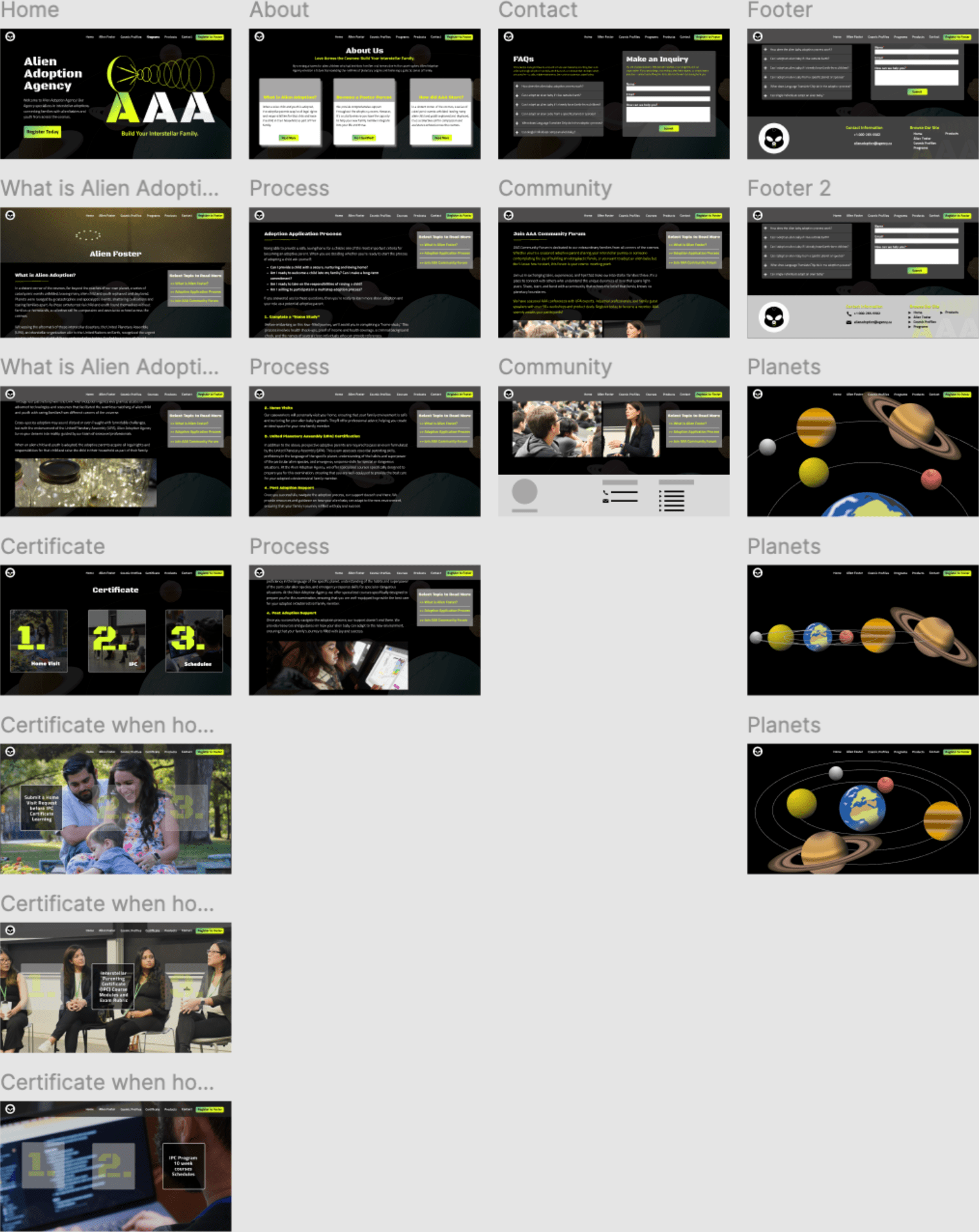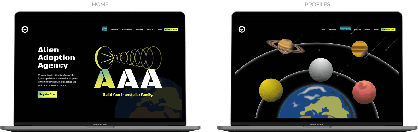As a front-end developer, service designer, and UI/UX designer for this team project, I focus on building the website using HTML, CSS, JS, and jQuery. Additionally, I contribute to brainstorming services, analyzing future markets for the alien adoption journey, and designing an intuitive user interface and seamless experience that integrates all aspects of the alien adoption services.
